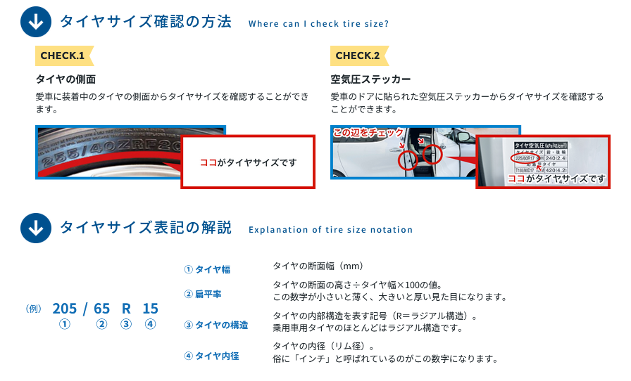 多くの場合、お車のフロントドア付近に、タイヤサイズ・適正空気圧などが記載されたステッカーが貼ってあります。取扱説明書でも確認できます。タイヤ本体側面にも記載がありますので、こちらの方が確実です。